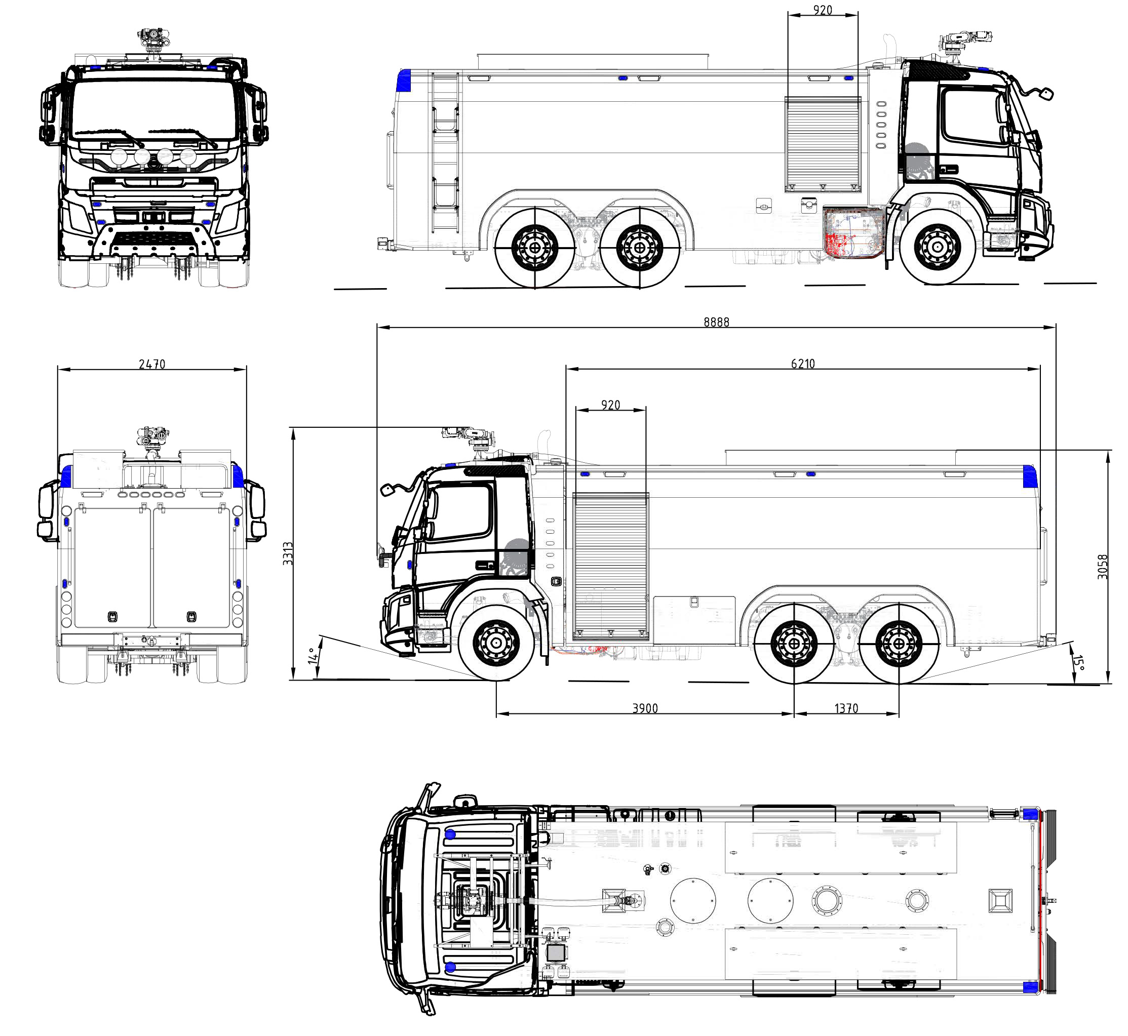 DMC około 12 500 kg, o wymiarach 8965 mm x 2550 mm x 3600 mm.
