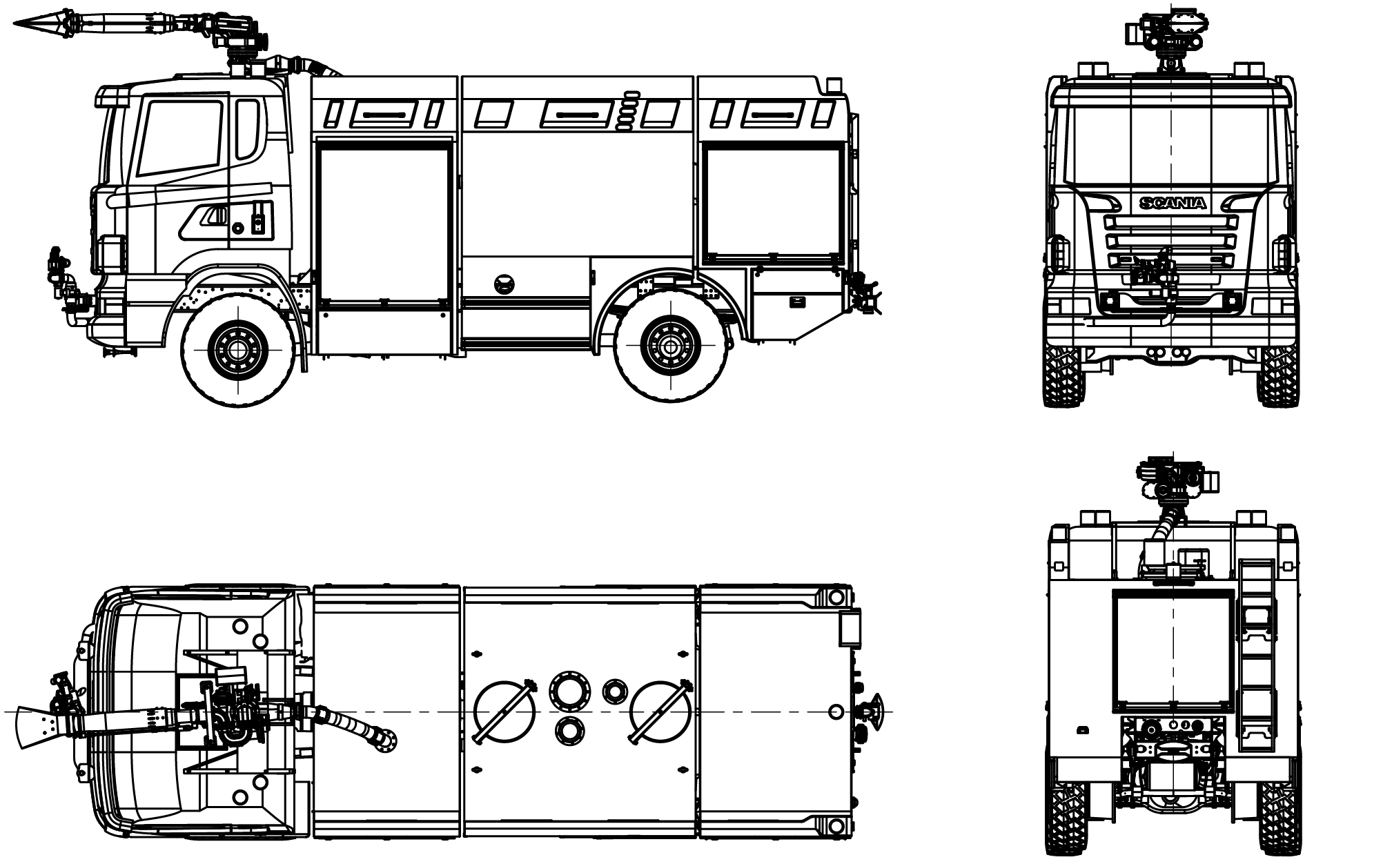DMC około 22 000 kg, o wymiarach 8300 mm x 2250 mm x 3900 mm. Pojazd wyposażony w działka zderzakowe i dachowe o wydajności 4000 l/min, 2000 l/min oraz 7 kg/s dla proszku.