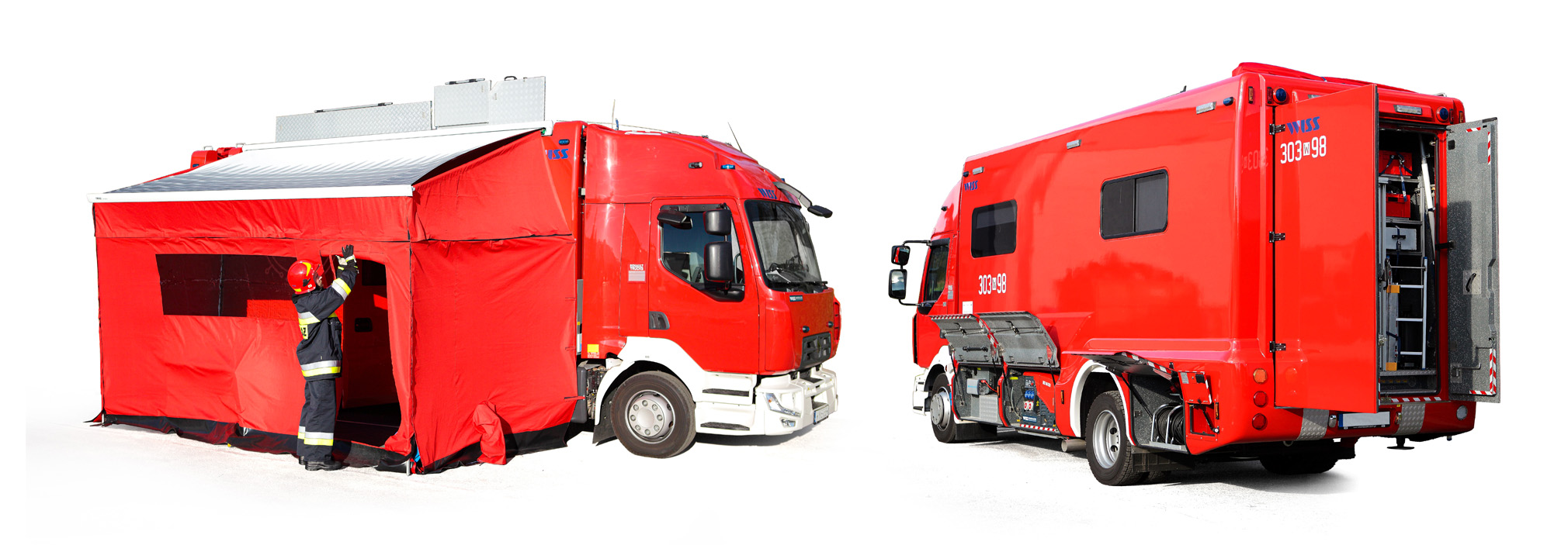 w standardach TETRA, DMR oraz VHF/UHF uzupełnionymi o routery LTE/5G z agregacją pasm i zewnętrzne Wi-Fi. Łączność wspiera pneumatyczny maszt wysuwany